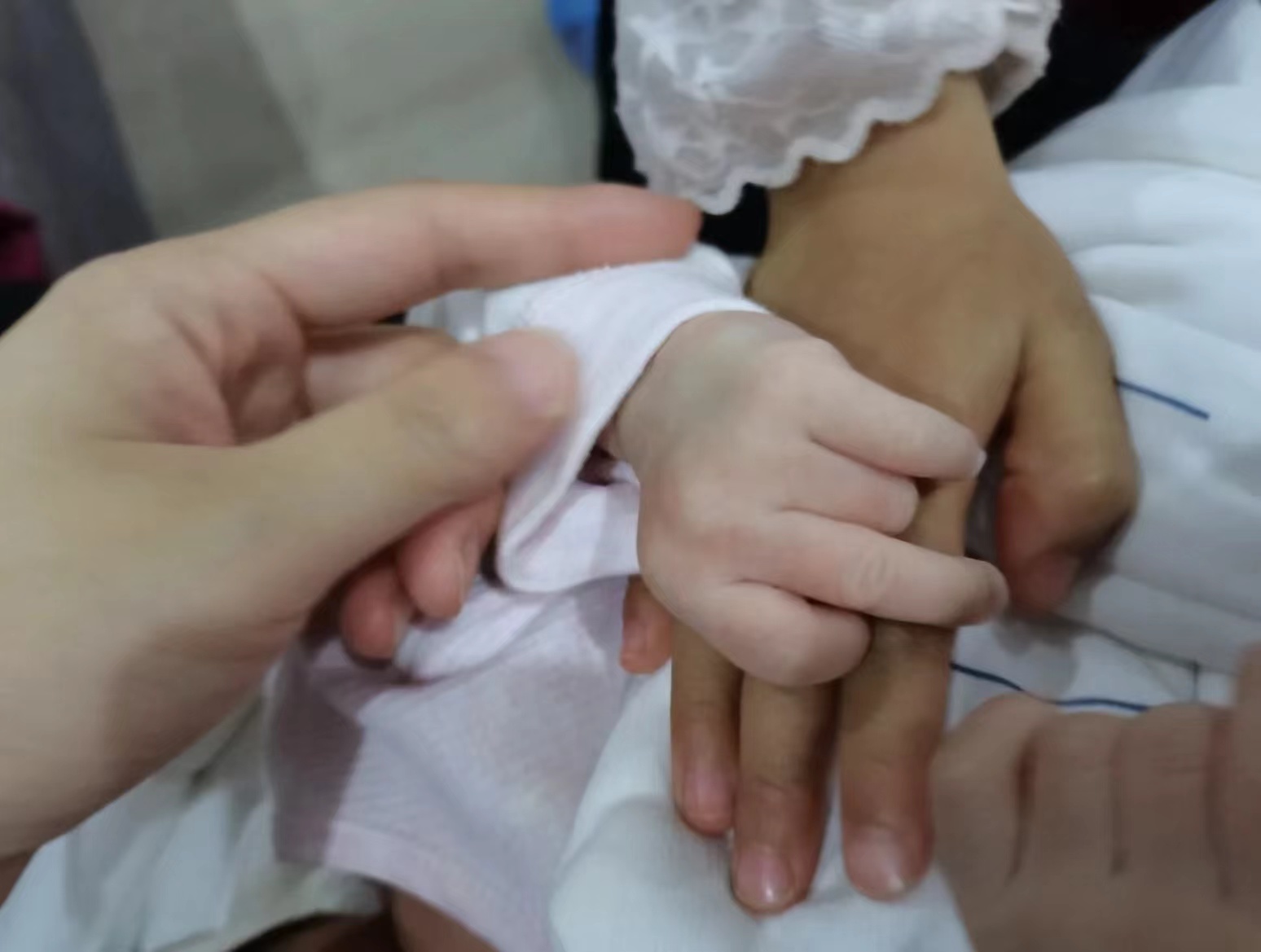 我和宝爸都是黄黑皮,不过宝宝皮肤出生就很白,这个我也很意外,我这儿还有她刚出生我们三个拍的照片呢